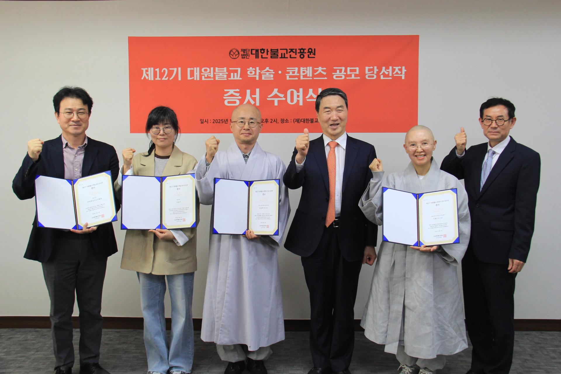 재단법인 대한불교진흥원(이사장 : 구상진)은 불교의 현대화 · 생활화 · 대중화라는 재단의 설립 취지를 새롭게 조명하고, 불교를 오늘의 현실에 맞게 연구하고 수행하는 연구자(단체)를 지원하기 위해 실시했던 <제12기 대원불교 학술·콘텐츠 공모>에 대한 최종 당선작 21편을 확정하고, 오늘(10월 14일) 증서 수여식을 거행했습니다.